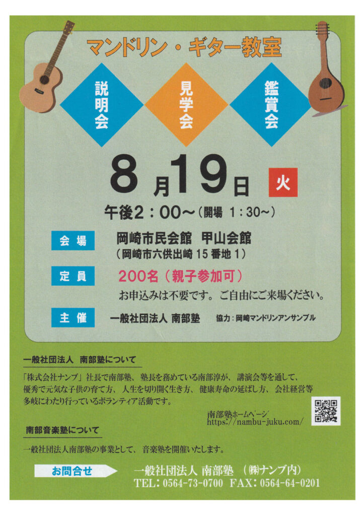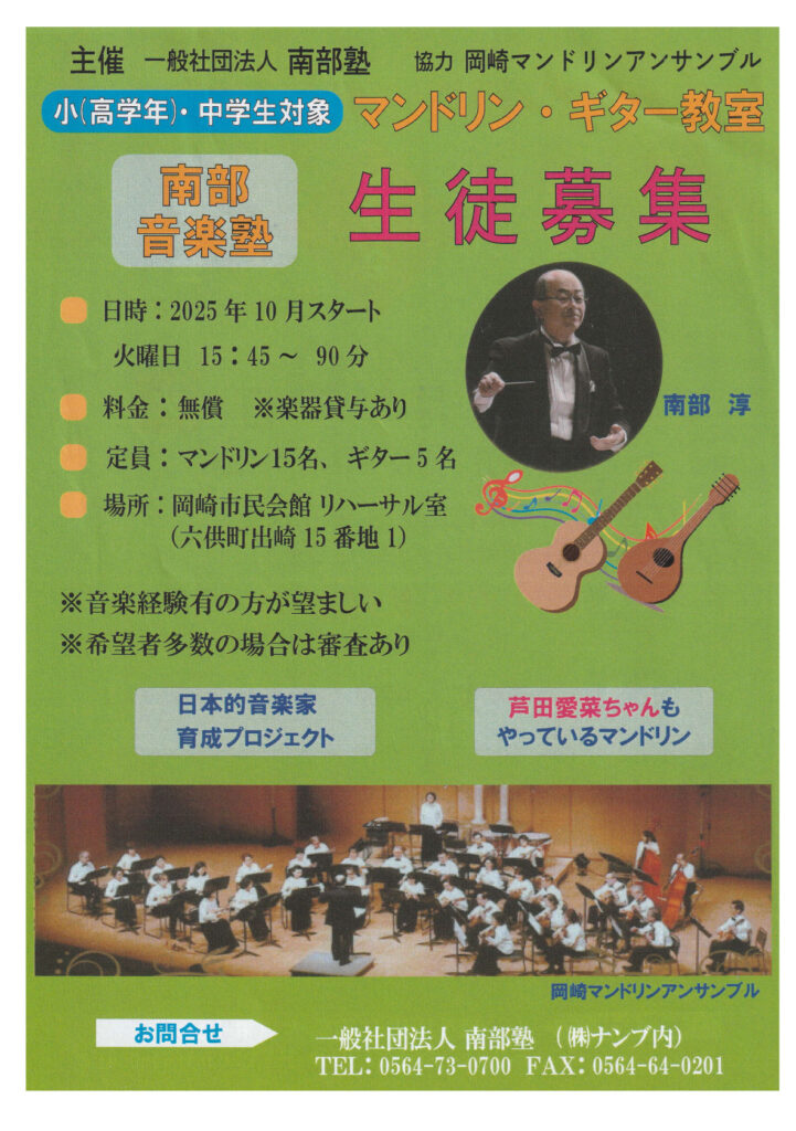 私の主催する「一般社団法人南部塾」でマンドリンとギターを、楽器も貸与し、無償で教える南部音楽塾を3年前から毎週行っておりまして、一期生、二期生がだいぶ上手になりました。9月にはCBC子供音楽コンクールに出る予定です。今は全員附属小学校、附属中学校の生徒、十数名です。